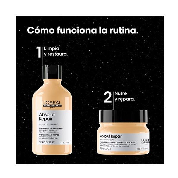 El champú Absolut Repair ofrece la experiencia de reparación profesional definitiva para cabellos dañados y secos. Los resultados están probados: El champú resurge visiblemente el cabello dañado con un tacto muy ligero y suave que resulta en un 77%* menos de daño en la superficie de la fibra. El cabello se vuelve manejable y 7 veces más brillante después del tratamiento, que incluye la mascarilla reparadora Absolut Repair.