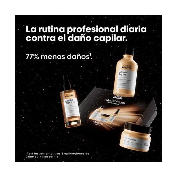 El set Absolut Repair (Champú + Mascarilla+ Aceite capilar) está enriquecido con proteínas de trigo y Omega 9, que ayudan a la reestructuración intensa de la fibra capilar y a la sensación de flexibilidad.