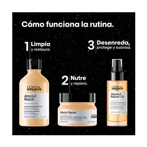 - El Aceite capilar Absolut Repair (90ml): Acción 10 beneficios: Nutrición; Reestructura el cabello; El cabello se vuelve aterciopelado; Cabello suave al tacto; Desenredante; Hidratación; ayuda al peinado; El cabello se vuelve brillante; Protege el cabello; Alisa el cabello.